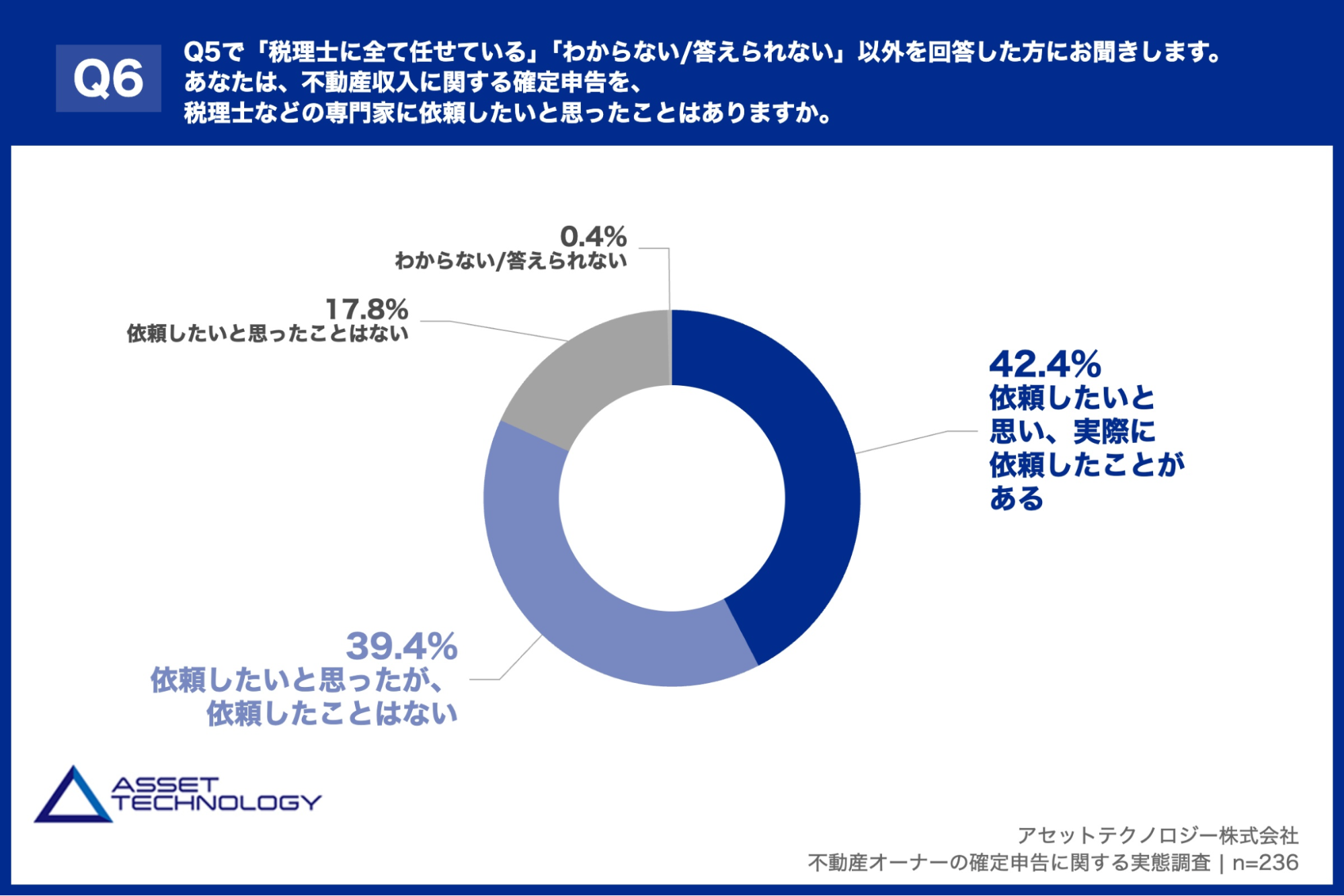「Q6. Q5で「税理士に全て任せている」「わからない/答えられない」以外を回答した方にお聞きします。あなたは、不動産収入に関する確定申告を、税理士などの専門家に依頼したいと思ったことはありますか。」(n=236)と質問したところ、「依頼したいと思い、実際に依頼したことがある」が42.4%、「依頼したいと思ったが、依頼したことはない」が39.4%という回答となりました。