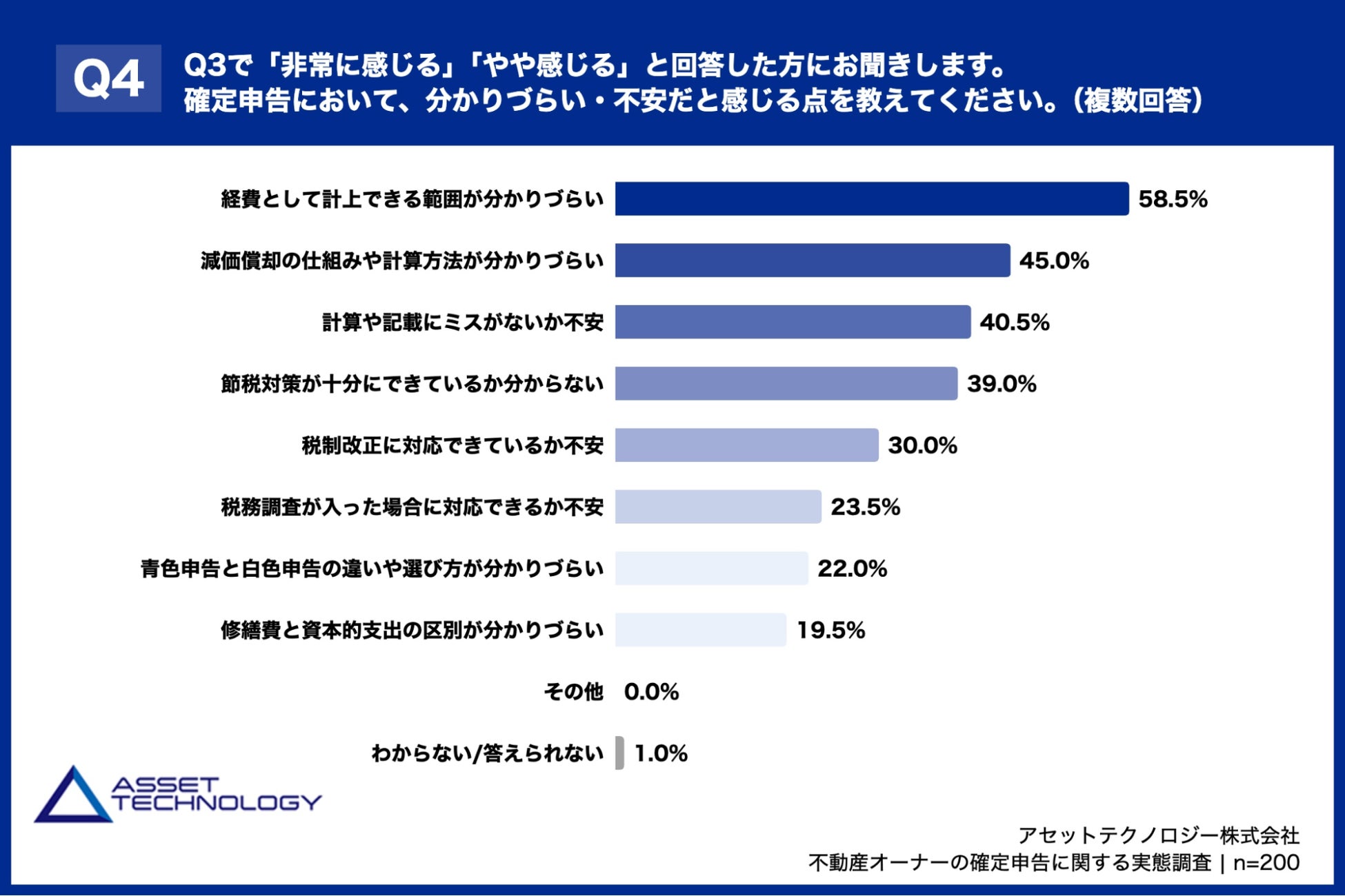 「Q4. Q3で「非常に感じる」「やや感じる」と回答した方にお聞きします。確定申告において、分かりづらい・不安だと感じる点を教えてください。(複数回答)」(n=200)と質問したところ、「経費として計上できる範囲が分かりづらい」が58.5%、「減価償却の仕組みや計算方法が分かりづらい」が45.0%、「計算や記載にミスがないか不安」が40.5%という回答となりました。
