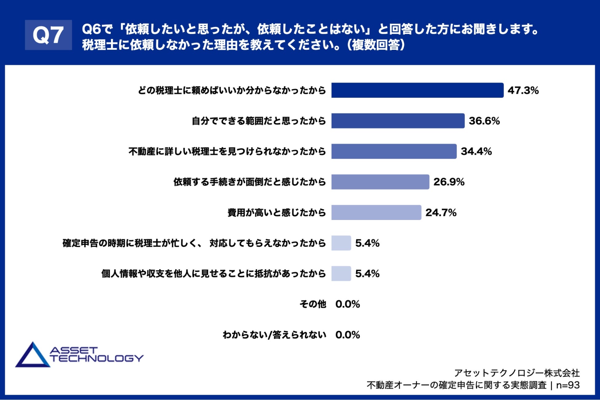 「Q7. Q6で「依頼したいと思ったが、依頼したことはない」と回答した方にお聞きします。税理士に依頼しなかった理由を教えてください。(複数回答)」(n=93)と質問したところ、「どの税理士に頼めばいいか分からなかったから」が47.3%、「自分でできる範囲だと思ったから」が36.6%、「不動産に詳しい税理士を見つけられなかったから」が34.4%という回答となりました。