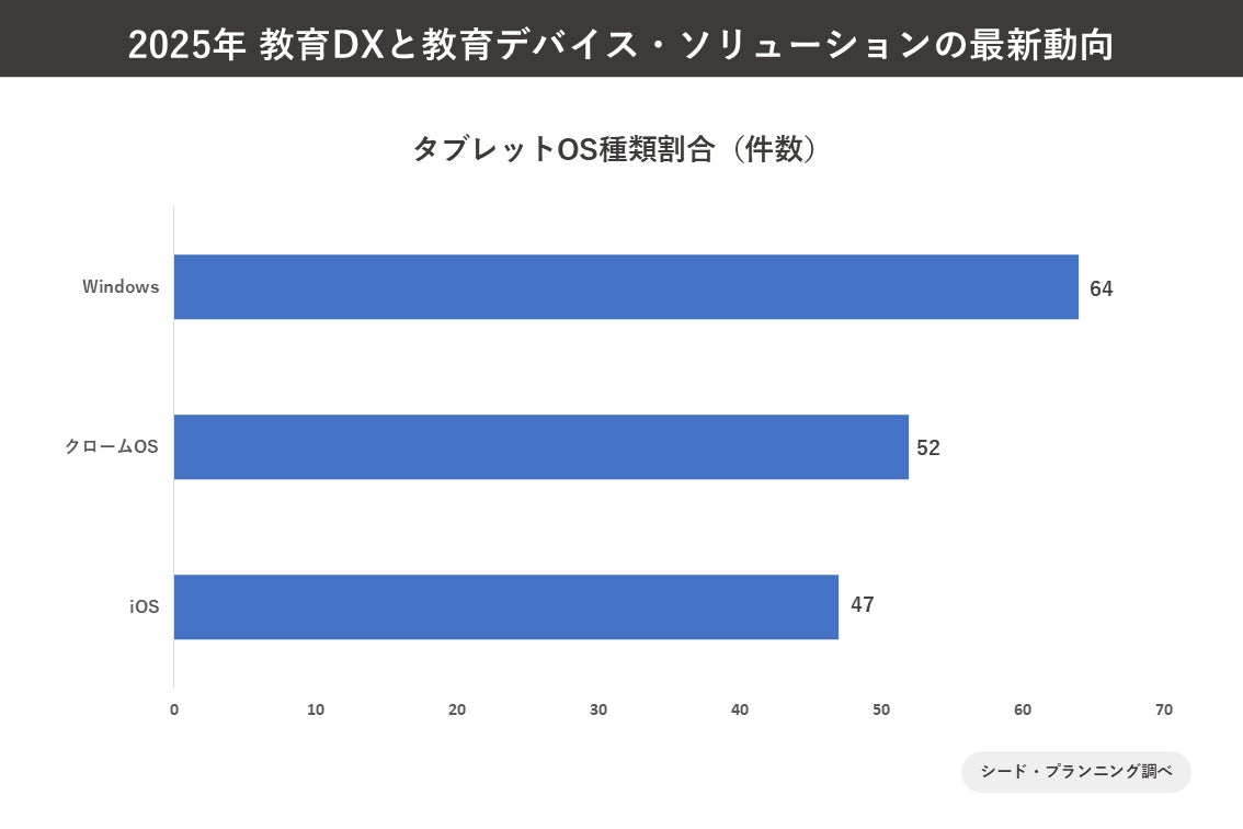 全国の教育委員会では、複数導入も見られるものの、Windowsが64件、クロームOSが52件、iOSが47件という結果となりました。