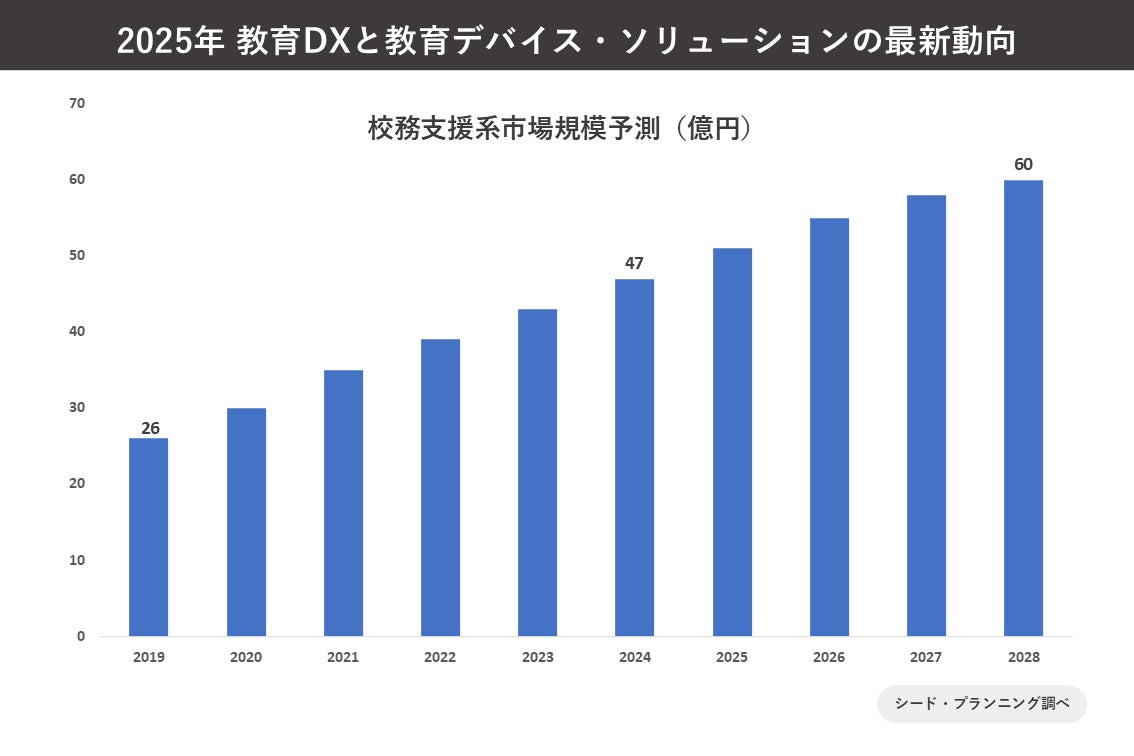 校務支援系システムの市場は2019年度26億円が2024年度47億円に伸長、2028年度60億円になると予測しました。
