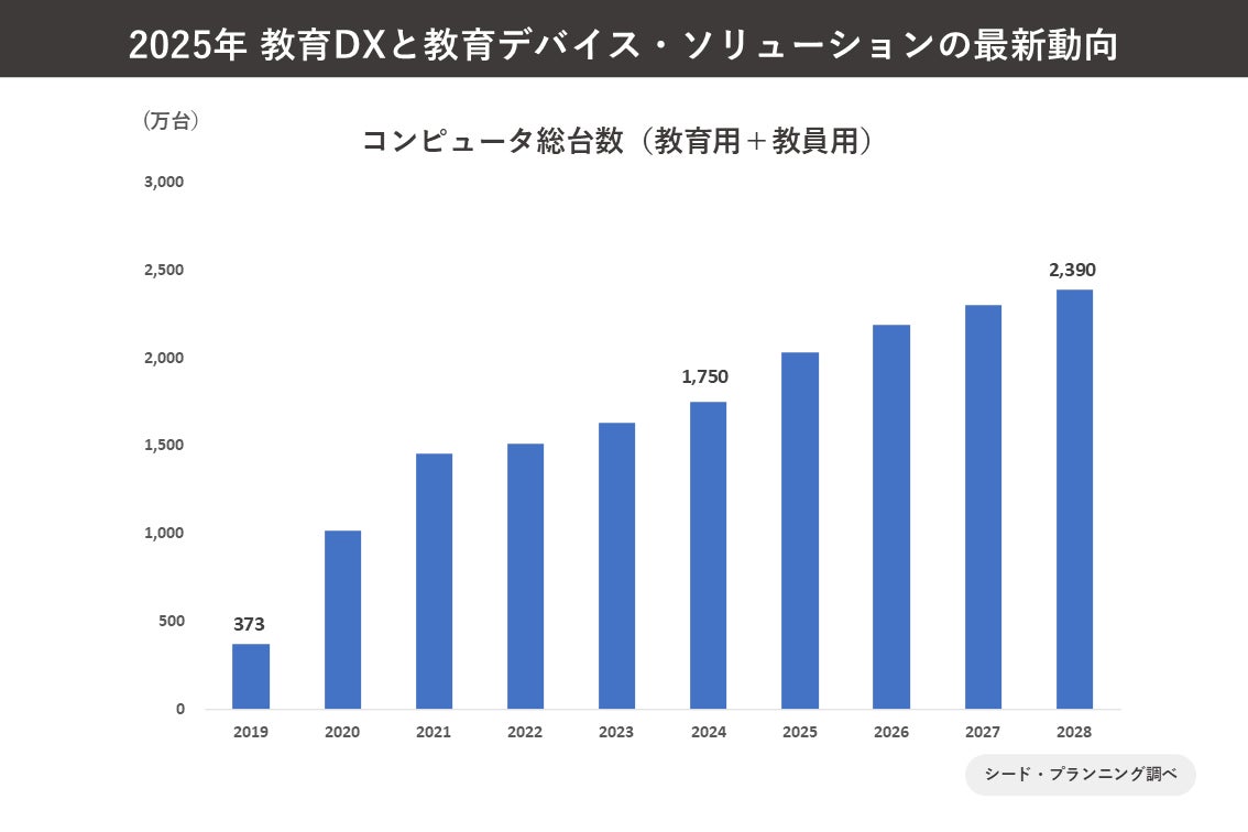 教育用コンピュータ総台数(教育用+教員用)は2019年度373万台が2024年度1750万台に伸長、2028年度2390万台になると予測しました。