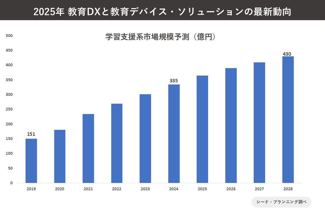 学習支援系システムの市場は2019年度151億円が2024年度335億円に伸長、2028年度430億円になると予測しました。