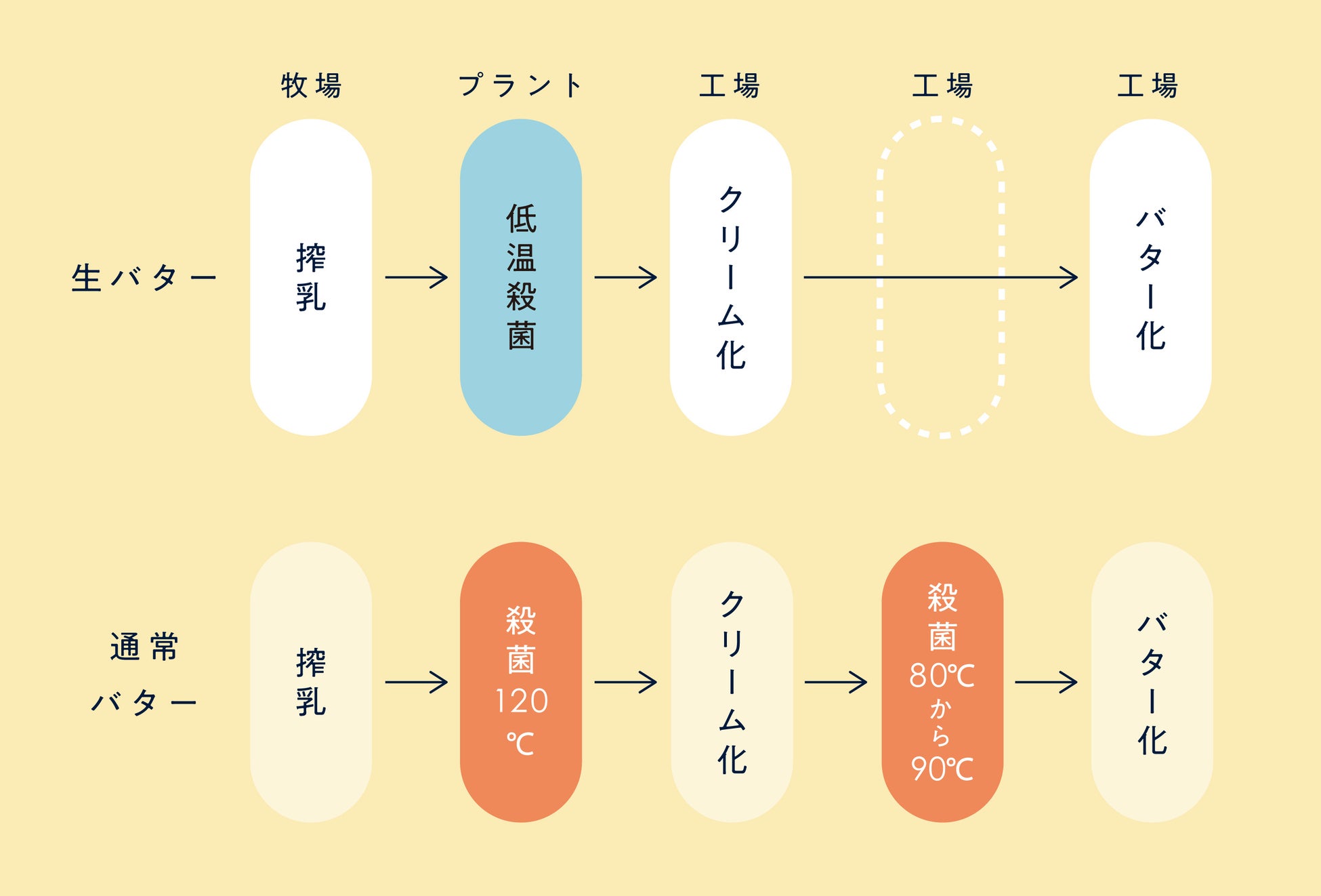 私たちは、搾りたての放牧牛乳を、必要最低限の殺菌処理とノンホモジナイズ製法で丹念に自社製造。「生乳が持つやわらかな風味と繊細さ」をそのままに守り抜き、長く豊かなコクの余韻が楽しめる独自の自家製“生バター”を完成させました。