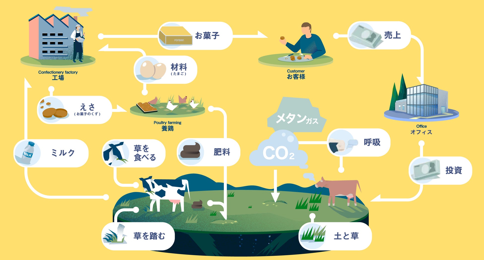 牛が草を食べ、自由に動き回ることで土壌が豊かになり、牧草による二酸化炭素の吸収を促進。ストレスなく育った牛からは、味が濃くおいしい牛乳が生まれます。
