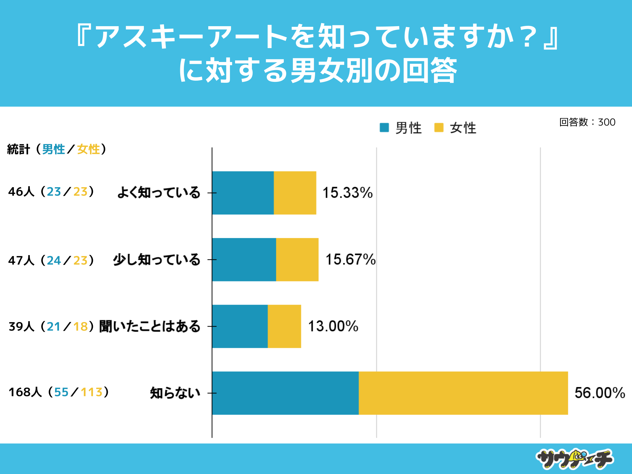 10〜30代男女を対象とした『アスキーアートを知っていますか?』というアンケートで、最も多かった回答は「知らない」で56%でした。
