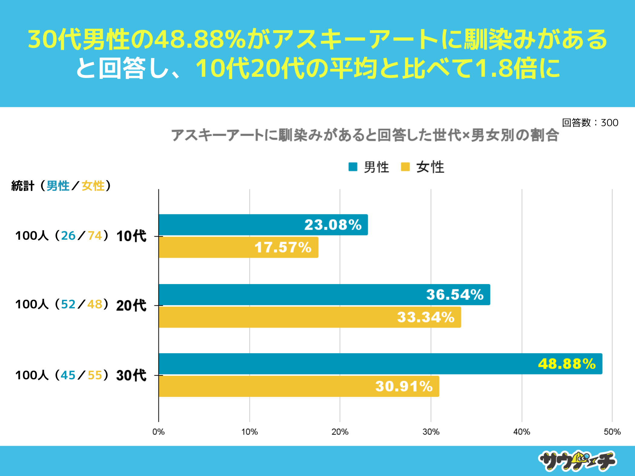 【30代男性の48.88%がアスキーアートに馴染みがあると回答し、10代20代の平均と比べて1.8倍に】