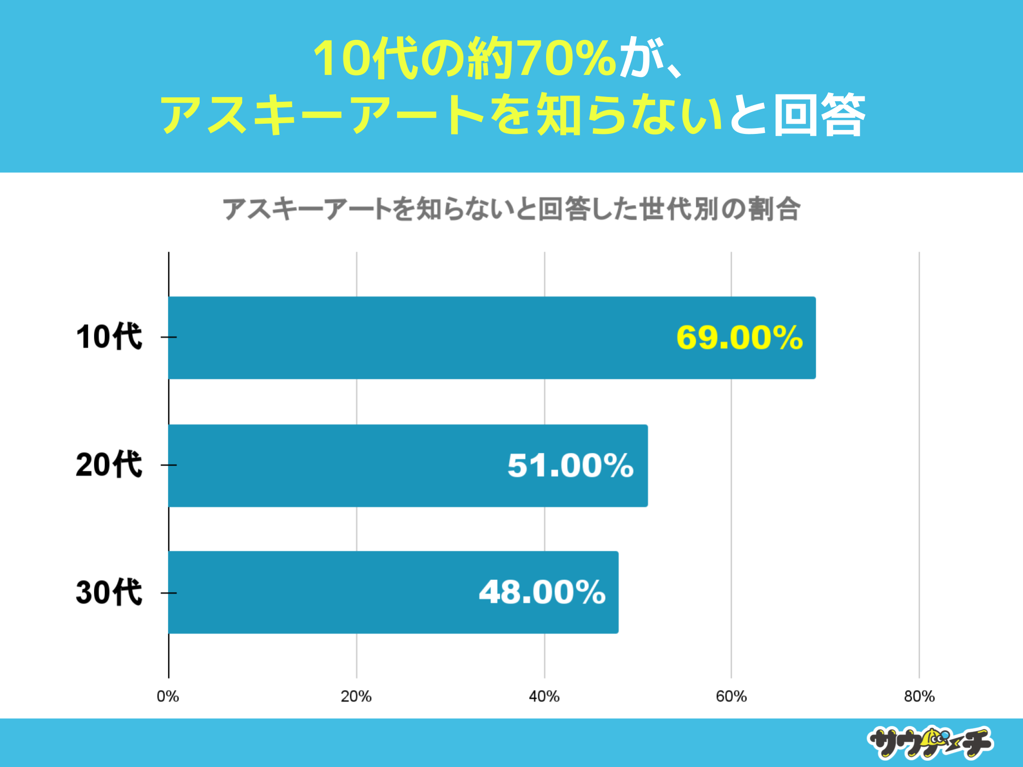 また、アスキーアートを知らないと回答した割合を世代別でみてみますと、10代の69%が最も高く、次いで20代の51%、30代が48%で、30代と比べて10代は1.4倍高い結果となりました。