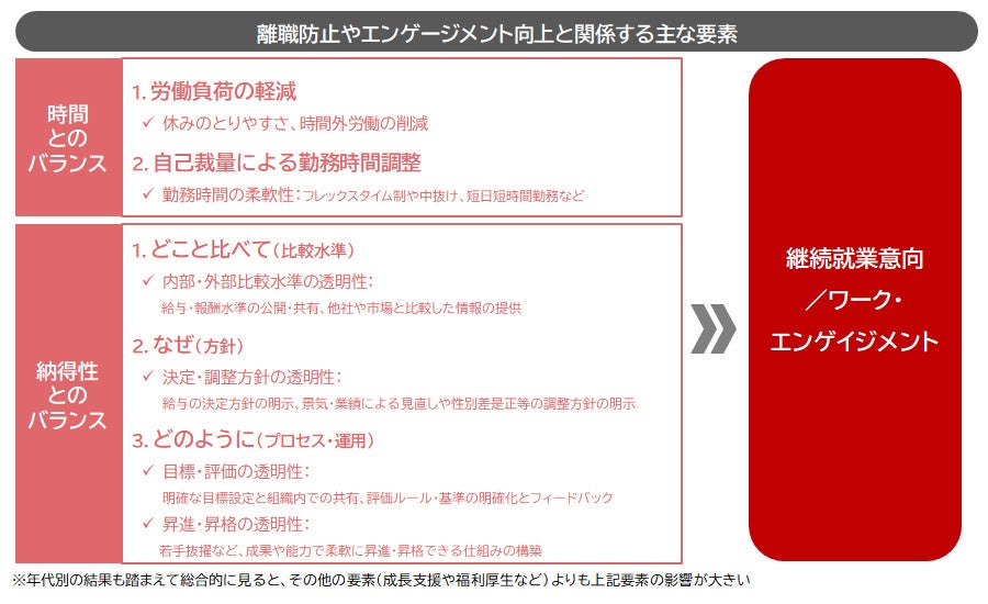 ① 継続就業意向に影響する主な要素<年代別>:具体的にどのような要素が継続就業意向に影響しているかを年代別に見た。時間とのバランスとしては、「休みのとりやすさ」や「時間外労働の削減」といった労働負荷の軽減が継続就業意向とプラスに関係する。また、納得性とのバランスとしては、給与の「調整方針の透明性」が継続就業意向に影響する。年代別に見ると、20代では、給与の「決定方針の透明性」、40代では「昇進・昇格の透明性」がTOP3に入ることが特徴。20~30代では、「昇進・昇格の透明性」は関係していない。