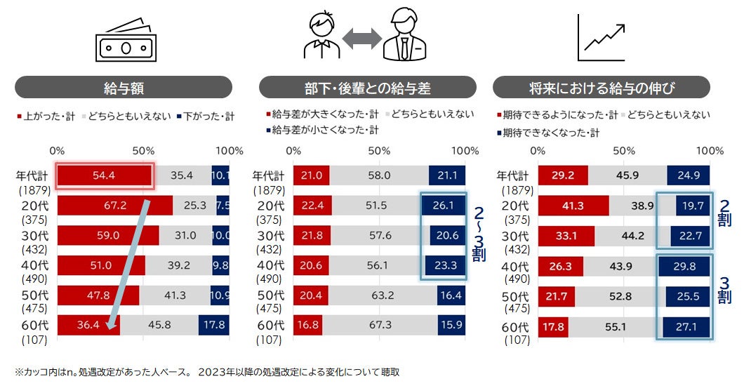 3.処遇改定後で給与が増えたのは若年層が中心:40代以下の2~3割が部下・後輩との「給与差の縮小」とこの先の「昇給期待の喪失」を感じている。