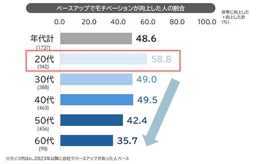 4.「ベースアップ」があっても半数はモチベーションが高まらず:自社でベースアップがあった人のうち、モチベーションが向上したのは約半数にとどまる。特に年代が上がるほど向上割合は低い。