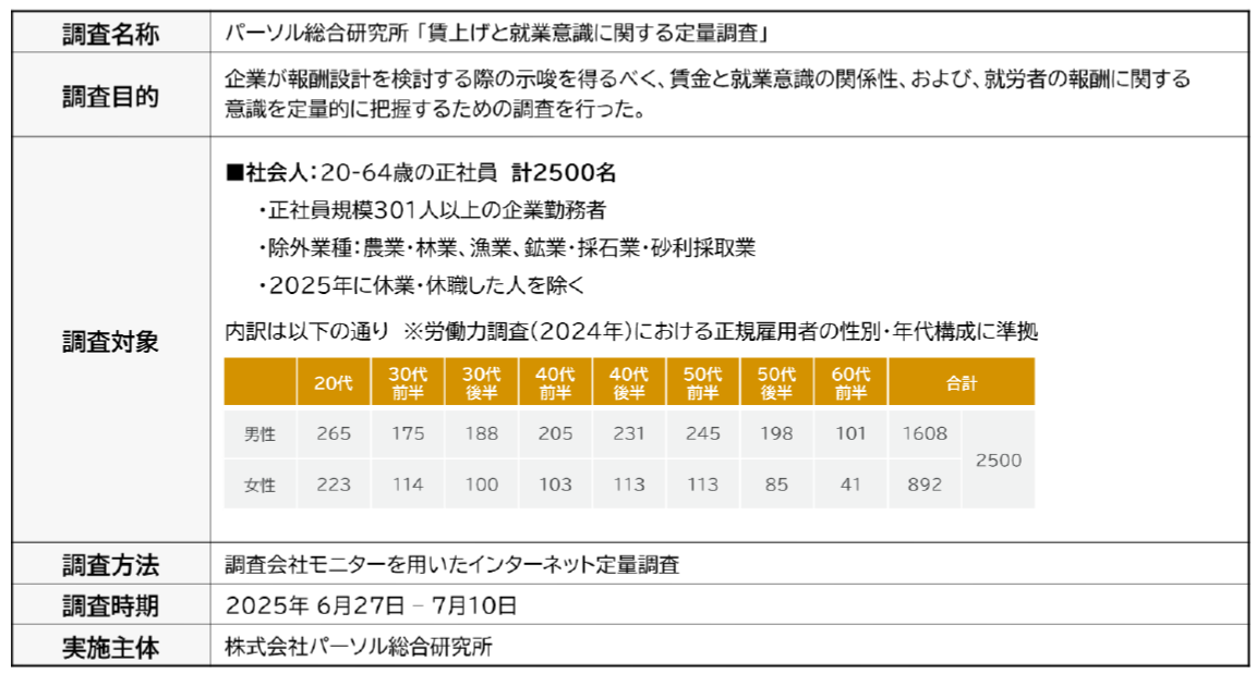 本調査は、賃上げが働く人の意識やモチベーション、継続就業意向にどのような影響を及ぼしているのかを明らかにすることで、企業の報酬設計や人材マネジメントに求められる課題と示唆を得ることを目的に実施しました。