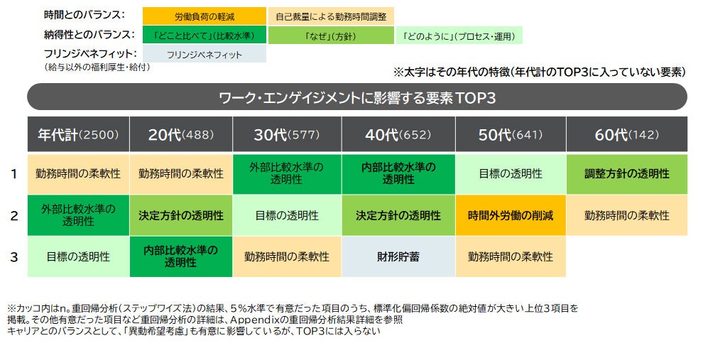 ② ワーク・エンゲイジメントに影響する主な要素<年代別>:具体的にどのような要素がワーク・エンゲイジメントに影響しているかを年代別に見た。時間とのバランスの中でも、「勤務時間の柔軟性」がワーク・エンゲイジメントとプラスに関係する。また、納得性の中でも、「外部比較水準の透明性」や「目標の透明性」がワーク・エンゲイジメントに影響する。年代別に見ると、20代や40代では、給与の「決定方針の透明性」、60代では給与の「調整方針の透明性」が関係していることが特徴。「昇進・昇格の透明性」はワーク・エンゲイジメントと関係していない。
