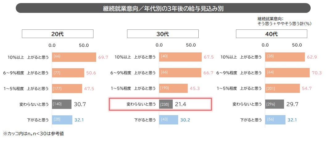 3年後の給与が「変わらない」と感じる層の継続就業意向は27.0%、「下がる」と感じる層(31.5%)と同水準