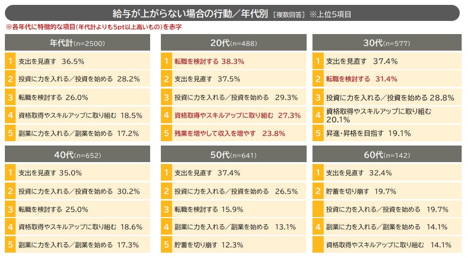 8.「給与が上がらない」場合、20代の4割が転職を検討:この先給与が上がらない場合の行動として多いのは、「支出の見直し」(36.5%)。次いで、「投資」(28.2%)、「転職」(26.0%) 。「昇進・昇格」や「資格取得・スキルアップ」といった社内での躍進を目指すよりも、社外での手段を検討する人の方が多い。特に20代・30代では、転職が上位の選択肢になりやすい。