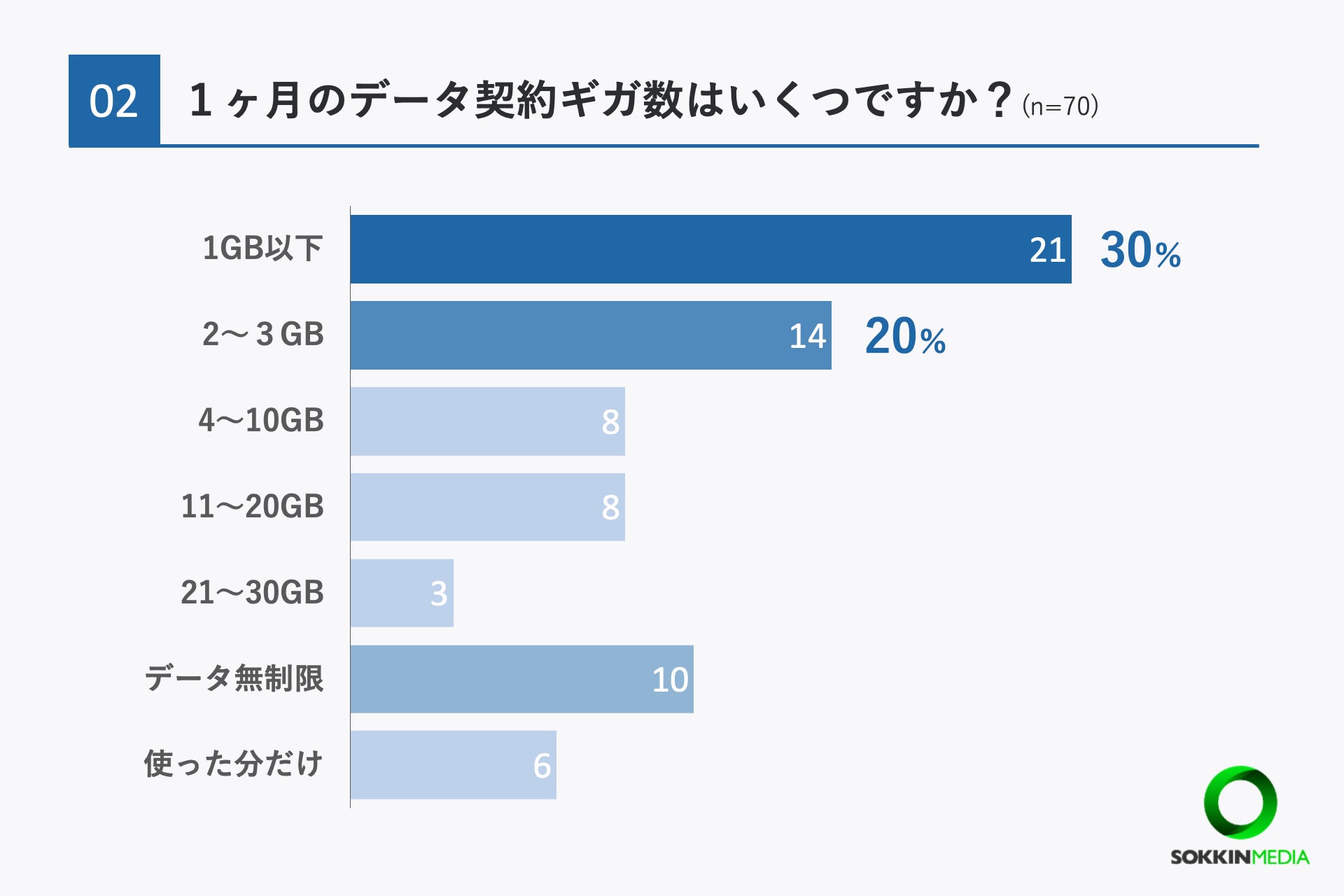 ・月々のデータ契約ギガ数で「1GB」と回答した割合が30%で最多