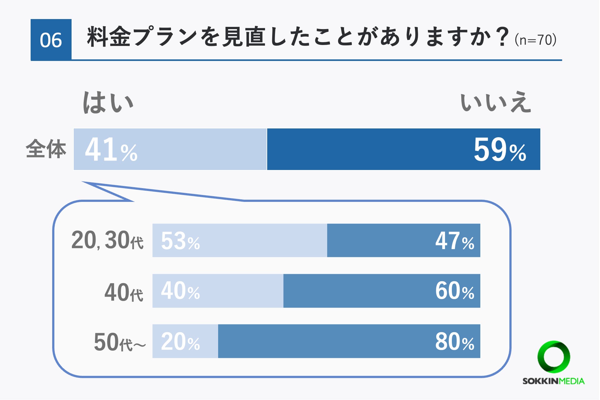 「Q6.料金プランを見直したことがありますか?」という問いに対して、「はい」と答えた方が41%、「いいえ」と答えた方が59%という結果になりました。