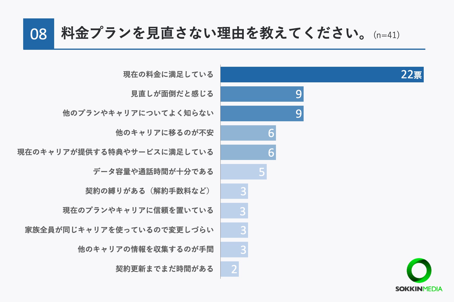 ・料金プランを見直さない理由として「現在の料金に満足している」が最多