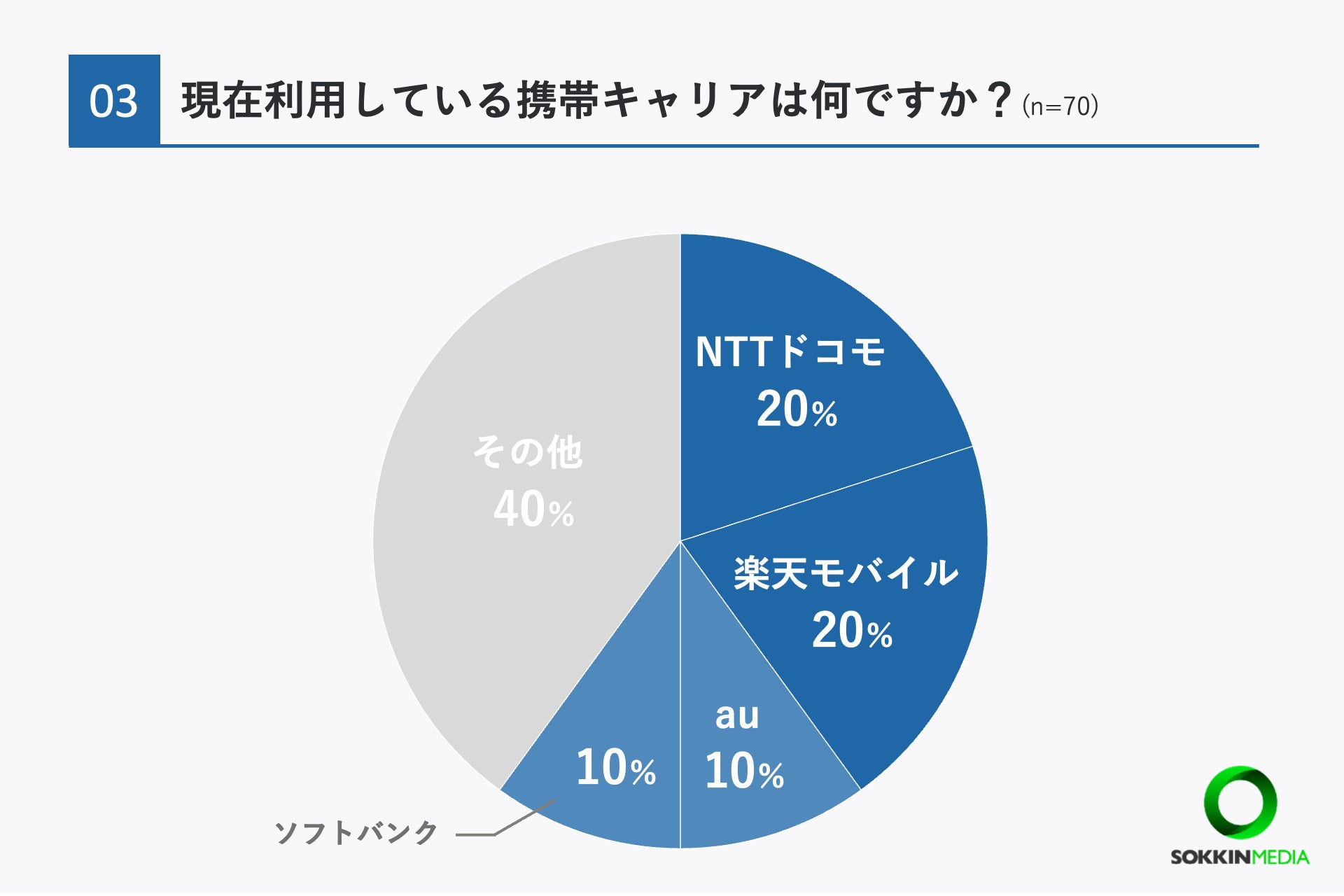 「Q3. 現在利用している携帯キャリアは何ですか?」という問いに対して、「NTTドコモ」「楽天モバイル」と回答した方の割合がどちらも20%で最も多いという結果になりました。