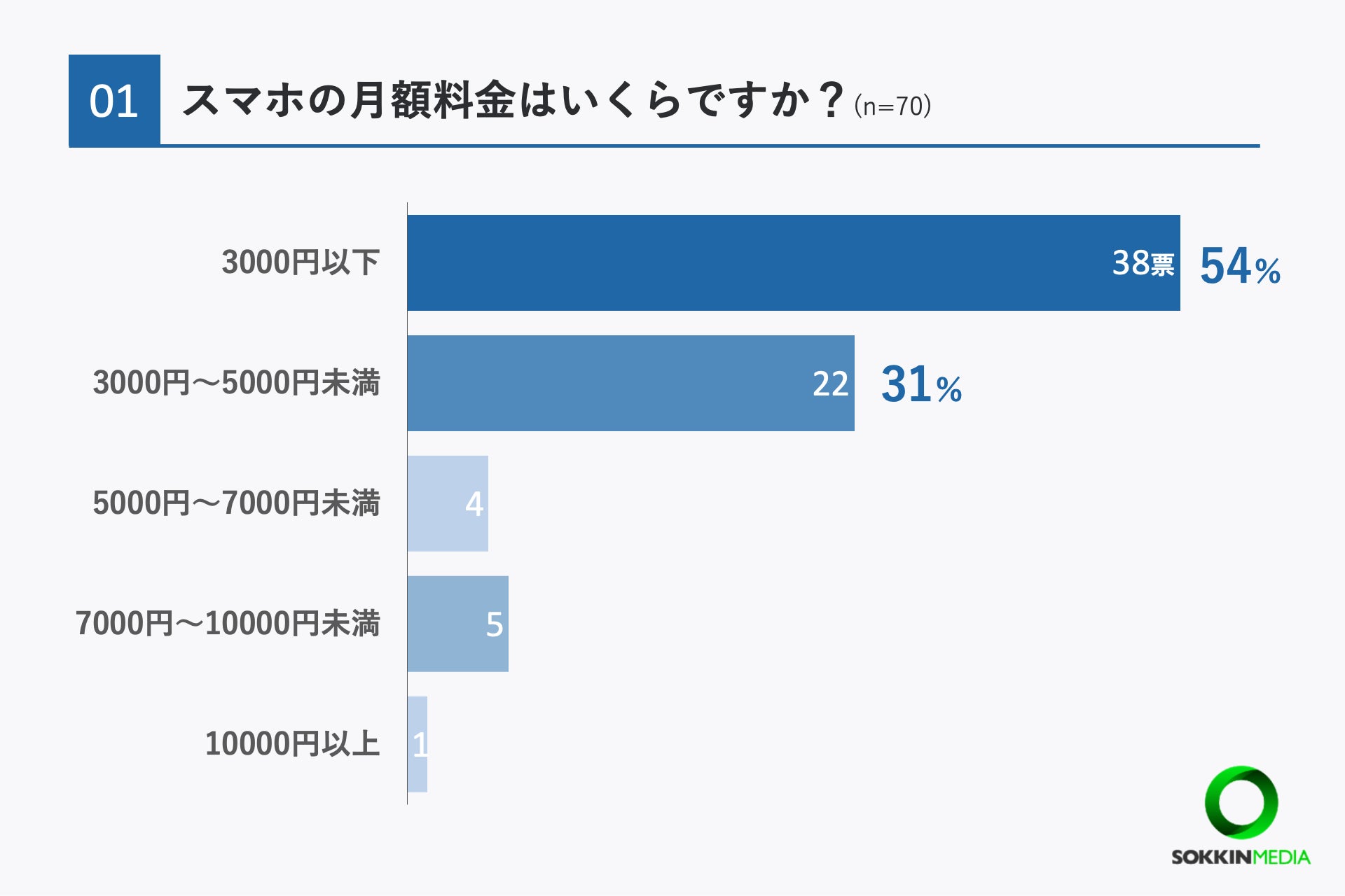 「Q1. スマホの月額料金はいくらですか?」という問いに対して、「月額3000円未満」と回答した方の割合が54%と最も多いという結果になりました。
