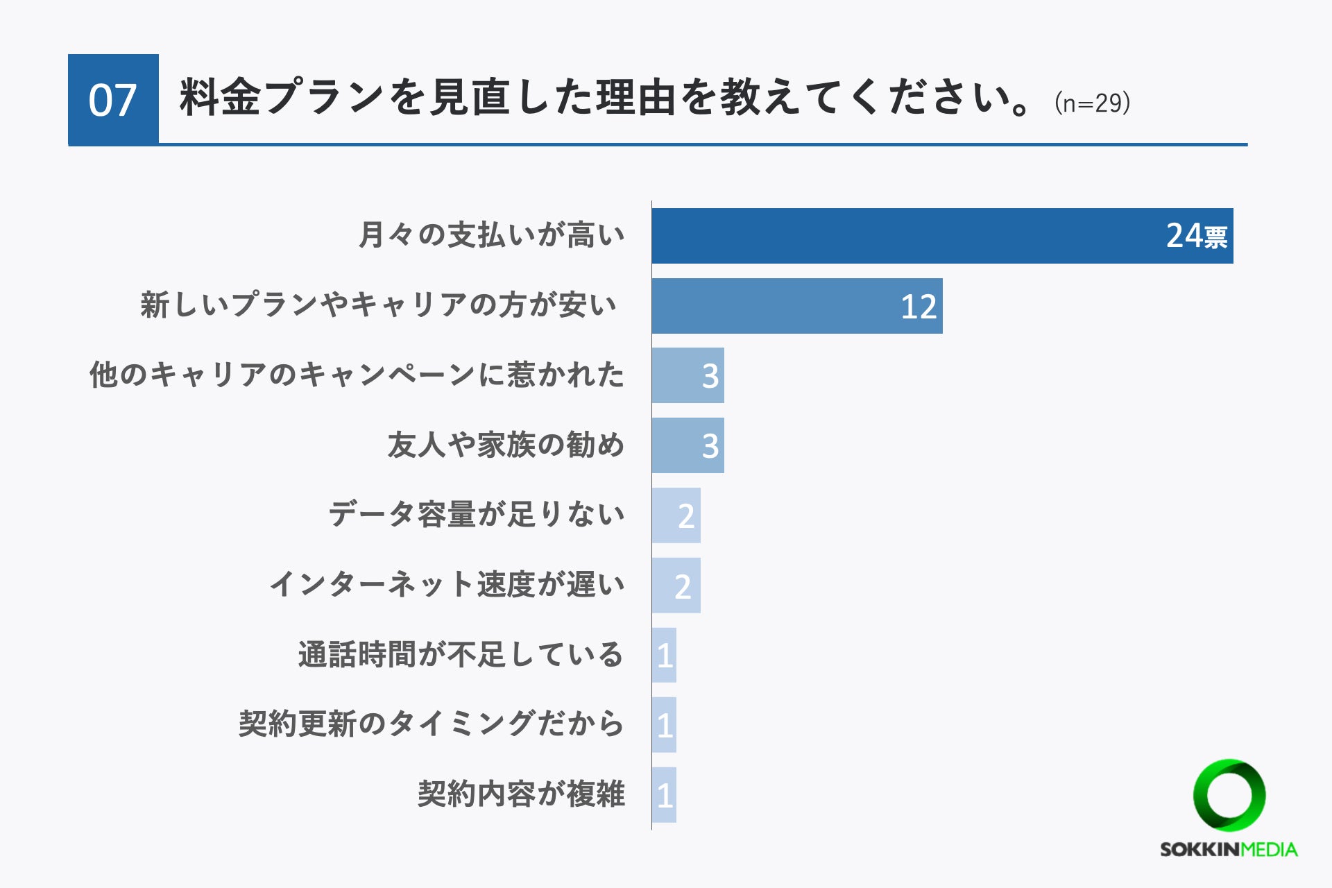Q6.において料金プランを見直したことがあると答えた方に対して、その理由について質問をすると、「月々の支払いが高い」ことを理由に挙げた方が最も多いという結果になりました。次いで、「新しいプランやキャリアの方が安い」という回答も多く見受けられました。
