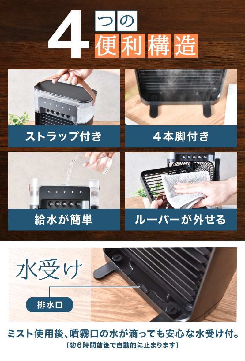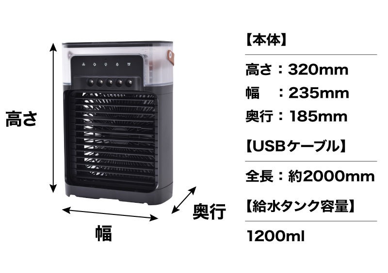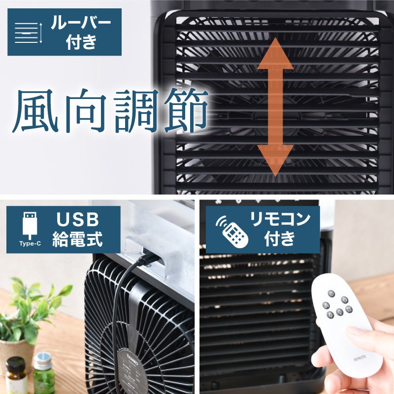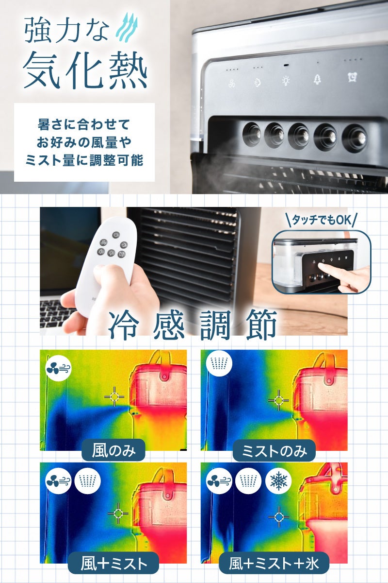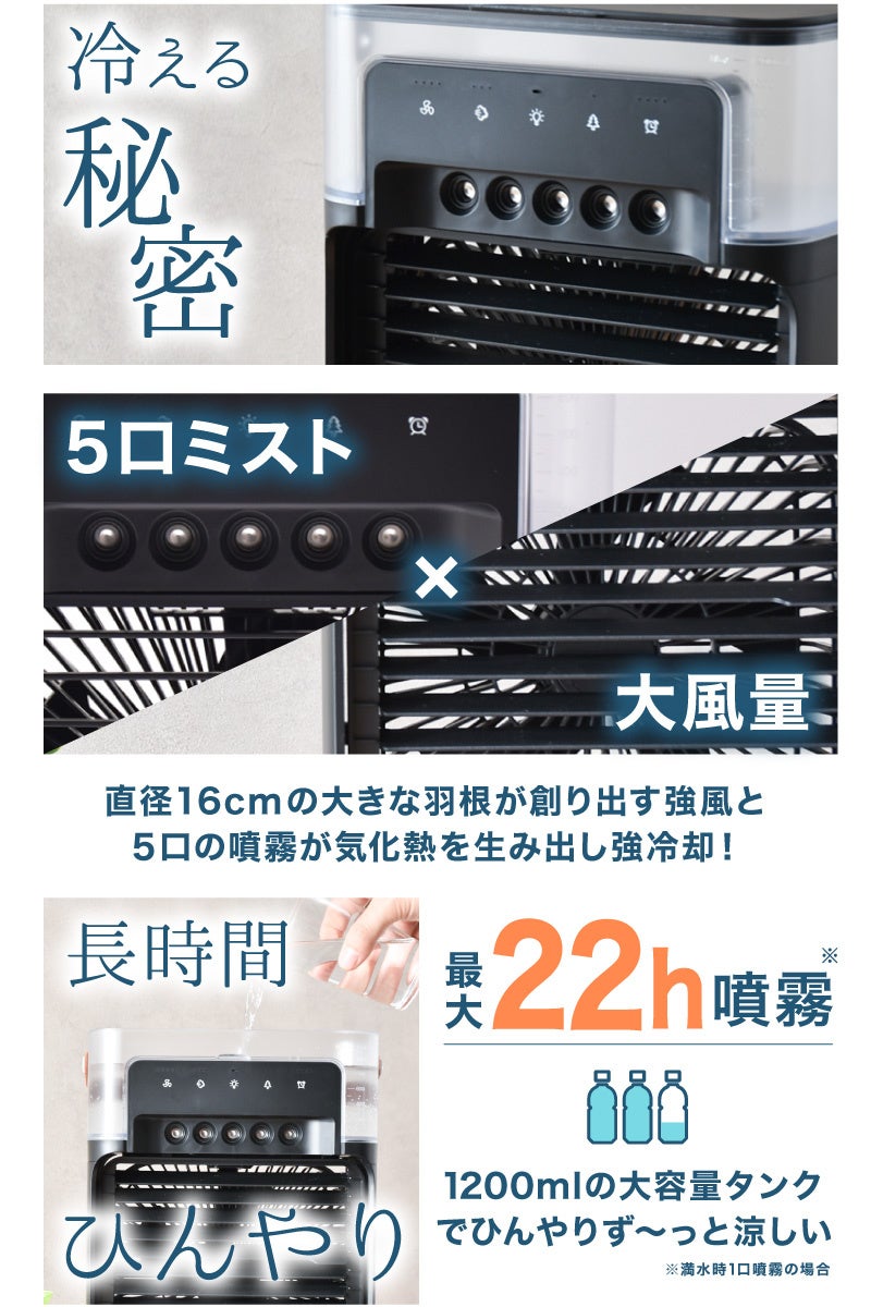 ストが周りの熱を奪いながら蒸発(気化熱)することで涼しく感じられます。タンク容量は最大1200mlで最大22時間噴霧(1口噴霧時)が可能。ファンは4段階に切り替えが可能。弱~強を繰り返すリズムモードを搭載。手元で操作できるリモコンが付属。タンク内に氷を入れて使うこともできます。
