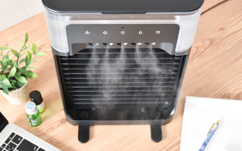本製品は卓上に置けるミストと風でひんやりと涼しいミストファンです。