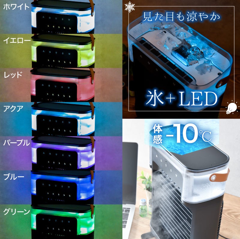 ファンのみでもでも動作可能。本体のLEDボタンを押すと、本体内部のLEDが点灯。ボタンを押すごとに色を切り替えられます(全7色+7色ランダム点灯)。自動で停止するオフタイマー機能付き(2、4、6、3時間)。