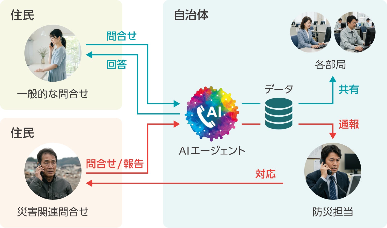 自治体の電話窓口には、税・福祉・各種手続きなどさまざまな問い合わせが途切れなく寄せられています。一方、生産年齢人口の減少により職員数の確保が難しくなるなか、業務は一層多様化・高度化しており、受電業務や部局間連携の効率化が求められています。特に災害発生時には短時間で着信が殺到し、命に関わる通報と一般的な相談が混在して多数寄せられるため、優先的に対応すべき通報を確実に抽出する仕組みが不可欠です。
