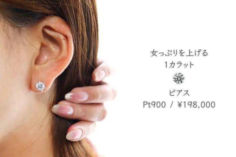 おおぶりダイヤのピアスも憧れそのもの。顔まわりが一気に華やかになり、シンプルな服装でもカジュアルな装いでも、一気にコーデがきまります。
