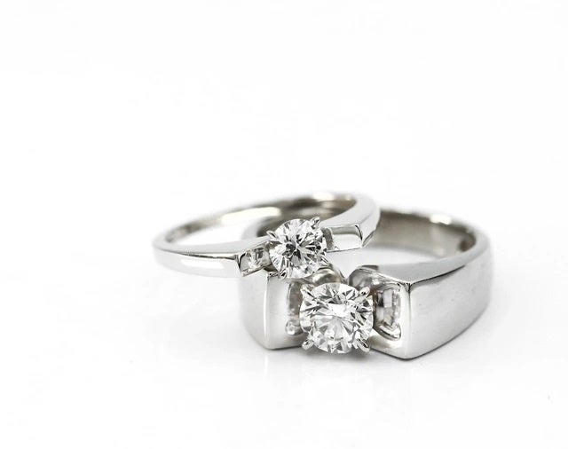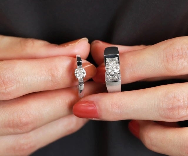 女性着用はシンプルで王道な6本爪のリング。おおぶりなダイヤがしっかり主張しつつ、華奢なリングが上品に煌きます。