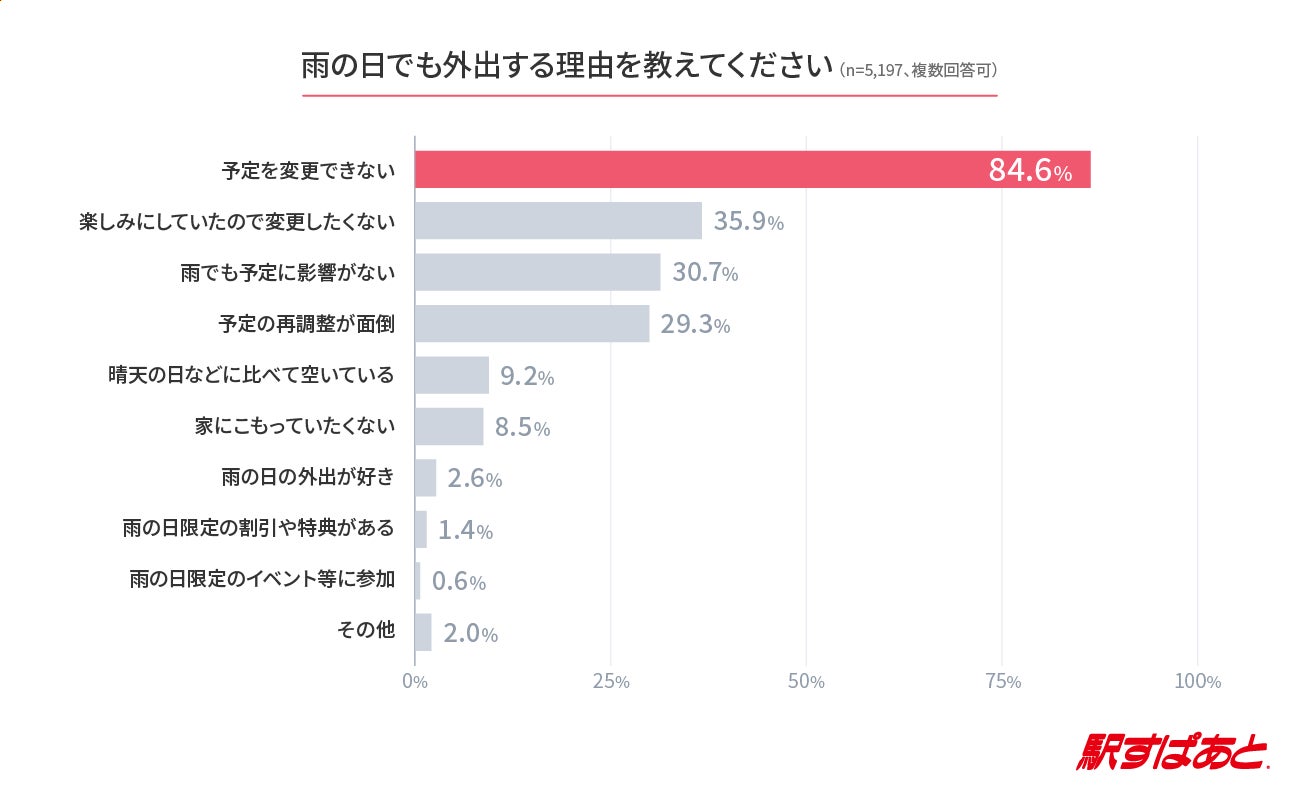 「雨の日でも外出する理由を教えてください」という質問には84.6%もの人が『予定を変更できない』と回答しました。また、『晴天の日などに比べて空いている(9.2%)』『雨の日の外出が好き(2.6%)』『雨の日限定の割引や特典がある(1.4%)』といった、雨の日ならではのメリットを選択した人は各1割以下と少数派でした。