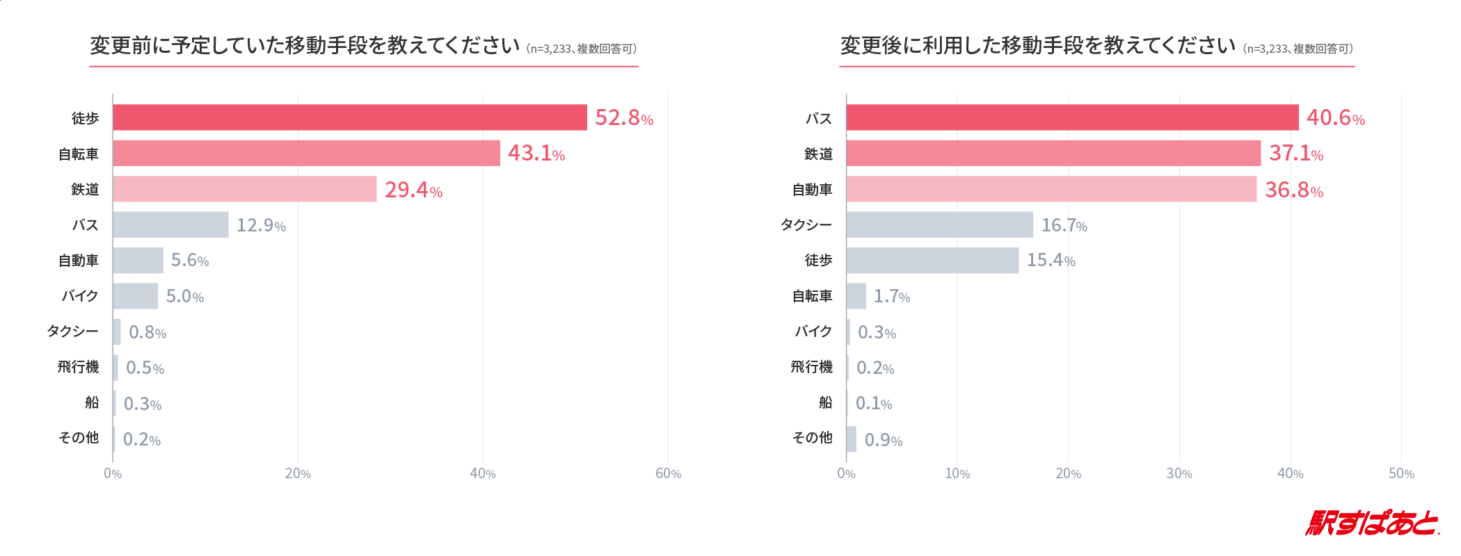 ・変更前に予定していた移動手段の1位は『徒歩』、2位『自転車』、3位『鉄道』