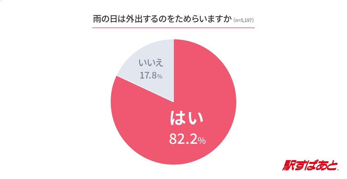 「雨の日は外出するのをためらいますか」という質問では、82.2%もの人が『はい』と回答しました。多くの人が雨の日に外出することを躊躇することが伺えます。