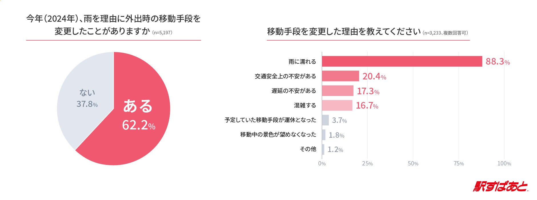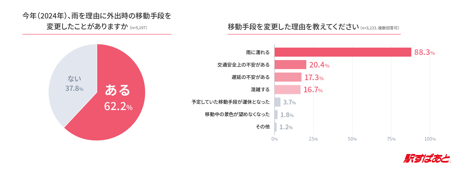 2024年に雨が理由で外出時の移動手段を変更した経験がある人は、62.2%でした。また、変更した理由を聞いたところ『雨に濡れる』と回答した人が約9割に上りました。雨に濡れることを懸念して、元々予定していた移動手段を変更した経験がある人が多いことが分かります。
