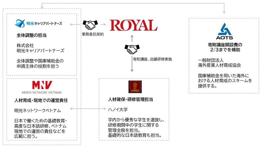 個別指導の学習塾「明光義塾」を運営する株式会社明光ネットワークジャパンの子会社である株式会社明光キャリアパートナーズ(本社:東京都千代田区、代表取締役社長:中川 拓哉)と、「『食とホスピタリティ』で、地域や社会を笑顔にする」というビジョンのもと、外食・コントラクト・ホテル・食品事業を展開するロイヤルホールディングス株式会社(本社:福岡県福岡市、代表取締役社長:阿部 正孝、以下「ロイヤルHD」)は、ベトナム・ハノイ大学の学生を対象とした人材育成プログラムを共同で開始いたしました。本取り組みは、一般財団法人 海外産業人材育成協会(AOTS)※1が経済産業省からの国庫補助金を得て実施する寄附講座事業を活用した、教育・企業・公的機関が連携する「教育起点の国際人材育成モデル」として推進いたします。