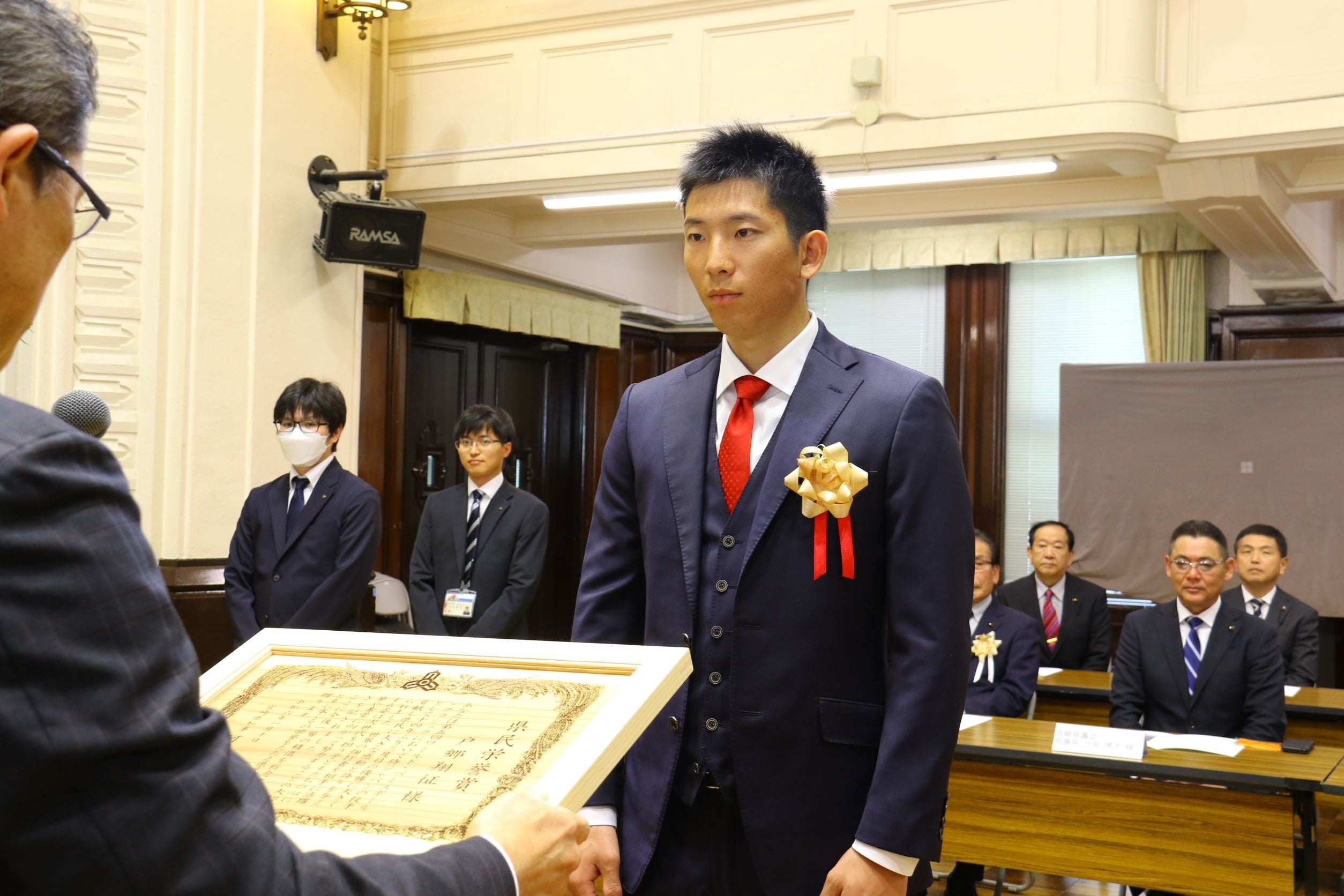 授賞式は本館講堂において行われ、戸郷選手に宮崎スギ製賞状と副賞(ガラス工芸トロフィー)を河野知事から授与しました。