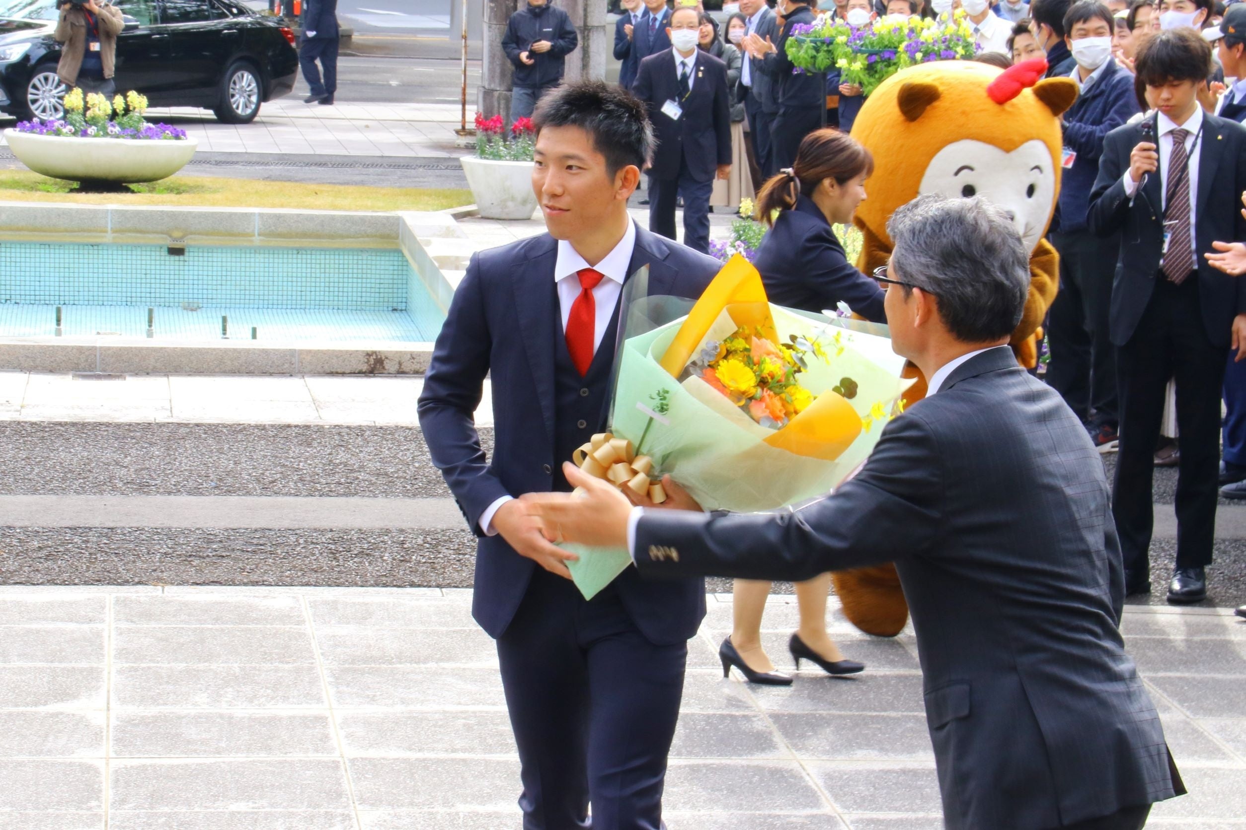河野知事、濵砂県議会議長をはじめ大勢の職員が迎えるなか、戸郷選手が宮崎県庁に来庁しました。