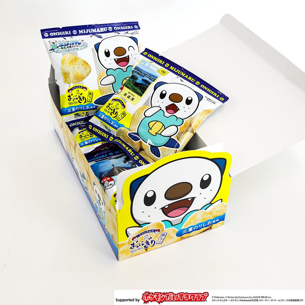 塩味のおにぎりせんべい「おにぎりせんべい銀しゃり」をベースに、厳選した三重県産の青さのり(ヒトエグサ)・天日塩・真鯛の魚醤を使用。海の幸に恵まれた三重県と、「ミジュマル」がみずタイプのポケモンであることから着想を得て、「三重県×ミジュマル」とのコラボにぴったりな海鮮系の「のりしお風味」に仕上げました。中の個包装は三重県の観光名所をあしらった10種類を含む、全12種類をご用意しました。旅の思い出に最適なのはもちろんのこと、お土産として受け取った方が三重県に足を運びたくなるようなデザインとなっています。