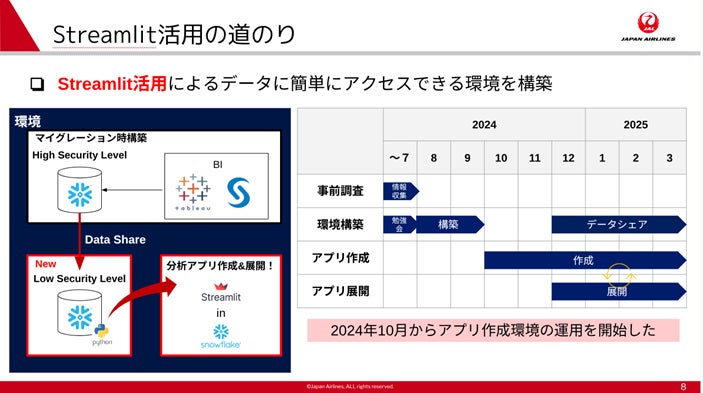 AIデータクラウドを提供するSnowflake合同会社(所在地:東京都中央区、社⻑執⾏役員:東條 英俊、以下Snowflake)は5月19日、日本航空株式会社(以下JAL)によるSnowflake Streamlitの活用に関する記者説明会を報道機関向けに開催しました。当日はJALデジタルテクノロジー本部デジタル戦略部 活用推進グループの庄司 稔氏とSnowflake Inc. Streamlit Co-Founder & COO Amanda Kelly(アマンダ・ケリー)が登壇し、JALのSnowflake Streamlitを活用した業務改善の取り組みを説明しました。