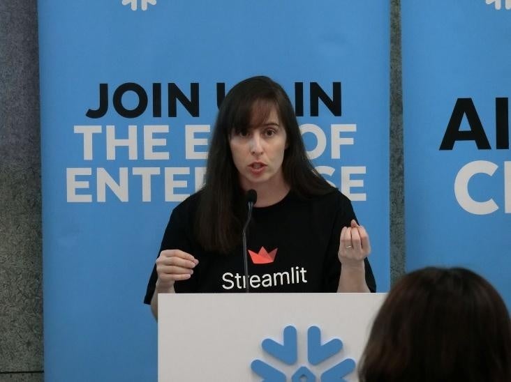 まず、SnowflakeのAmandaが、オープンソースのPython用UIライブラリである「Streamlit」について説明しました。Amandaは、「企業のアイデア実現には、Streamlit単独ではなくSnowflakeの信頼できるデータ基盤との組み合わせが重要であり、これによりスケーリングやコスト管理、開発から運用への迅速な移行が可能になる」と強調。Snowflake内でStreamlitを直接実行できるため、環境設定やセキュリティの懸念がないこと、コード作成を支援するCopilotを活用すること、そしてコードを安全に生成し管理することの重要性を語りました。