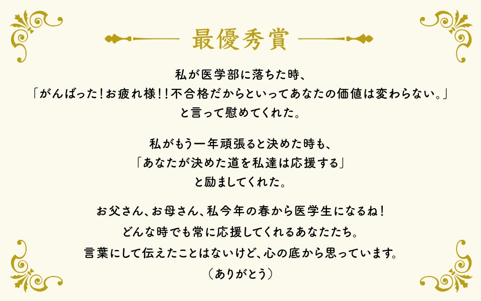 失意のとき、こんな力強い言葉をかけてくれるご両親の存在に感銘を受けました。きっとその一言が、悔しさや迷いを“前に進む力”へと変えてくれたことでしょう。再挑戦を決めたときにも、変わらず背中を押してくれたご両親への思い。これまで言葉にしきれなかった感謝の気持ちが、しっかりと伝わってくる作品でした。