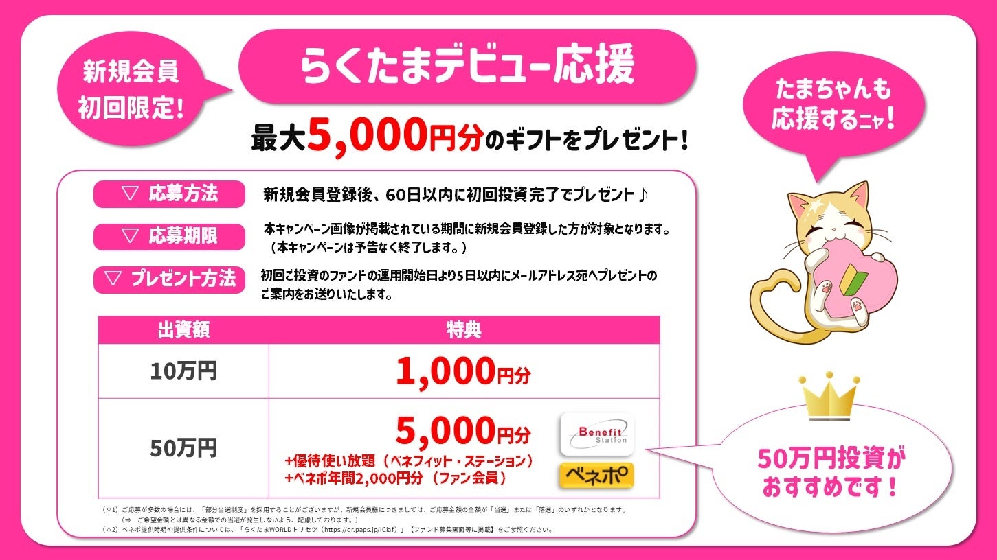 なお、募集期間中に新規会員登録をされた方は、登録日から60日以内に初回投資を完了いただくことで、プレゼントの対象となります。