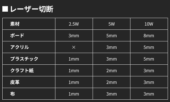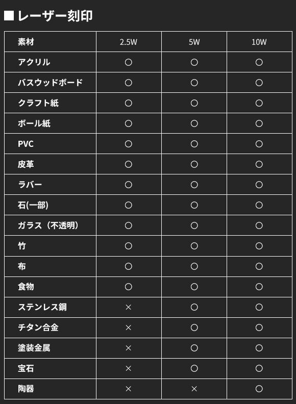 2.5Wの出力は金属を除くほとんどの素材の彫刻に対応できます。塗装金属の彫刻や切断機能が必要な場合は、5Wおよび10Wの出力をお勧めします。業務用途または彫刻速度や切断機能を最大限活用する場合には10Wの出力が最適です。