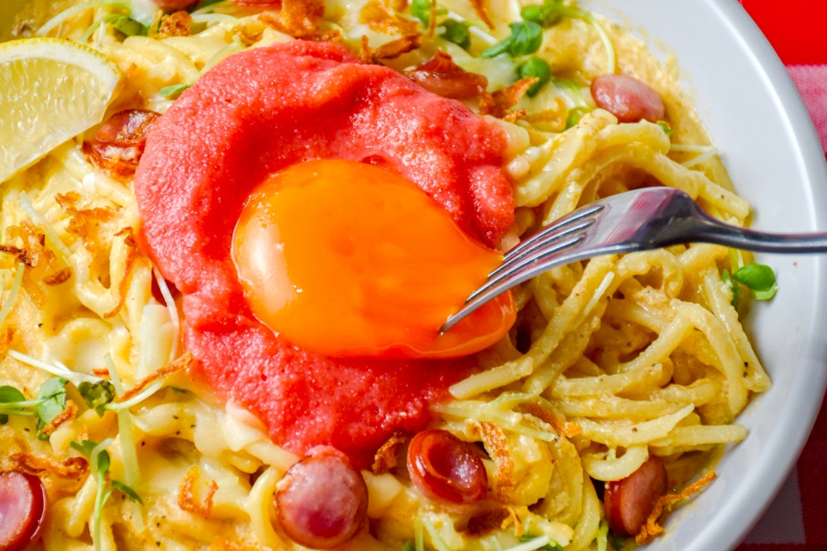 春の期間限定メニューはパンチョならではの、にんにくとチーズ風味のカルボナーラ風まぜスパ。パンチョの定番人気メニュー「白ナポ」もカルボ系ですが、より濃厚でコク深くカルボ感をアップ。その上にはピリ辛の明太子ソースと卵黄(テイクアウトは玉子焼き)を、そして旨味をさらに引き立てるスライスソーセージをトッピングしたホワイト系のパンチョに仕上げました。カットレモンを絞ればさっぱり味変も試せちゃう。こく旨明太チーズカルボ風を最後まで楽しんでいただけるよう、ミニリゾット用のオリーブオイルをあえた追いオリーブ飯も無料でご提供します。