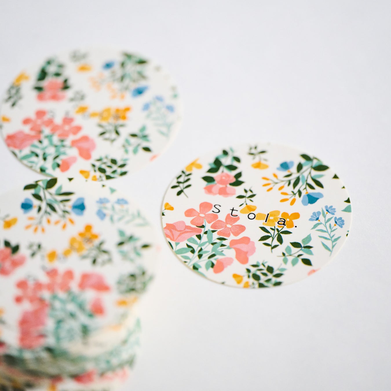 またStola.ショップ・オンラインでは、スカーフとポーチのフラワープリントを用いたステッカーをプレゼントするキャンペーンも開催。コラボレーションアイテム1点以上、もしくは¥22,000以上の購入で1枚ステッカーをプレゼントする。