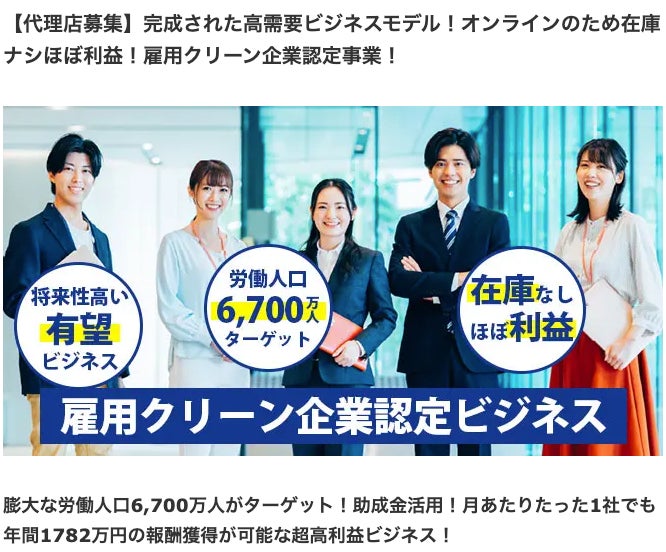 将来性高いビジネスモデルで反響殺到中!「雇用クリーン」事業の代理店を募集開始しました