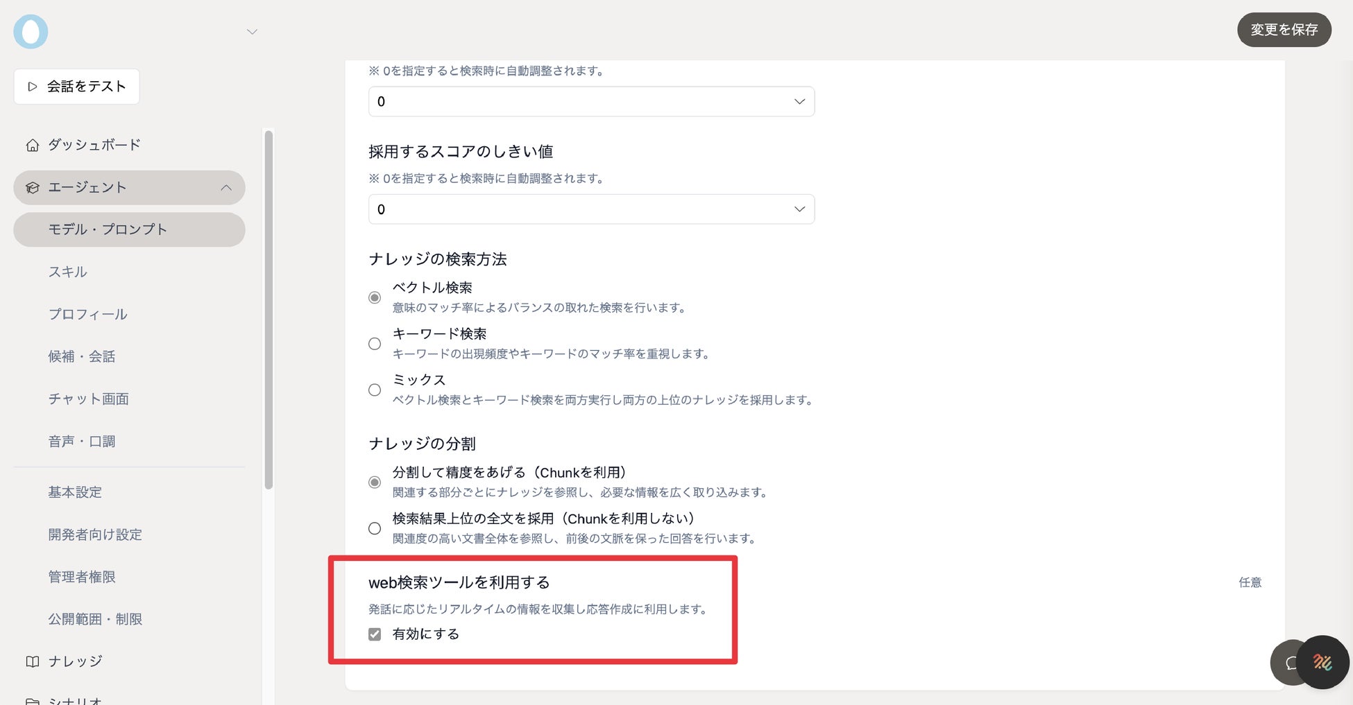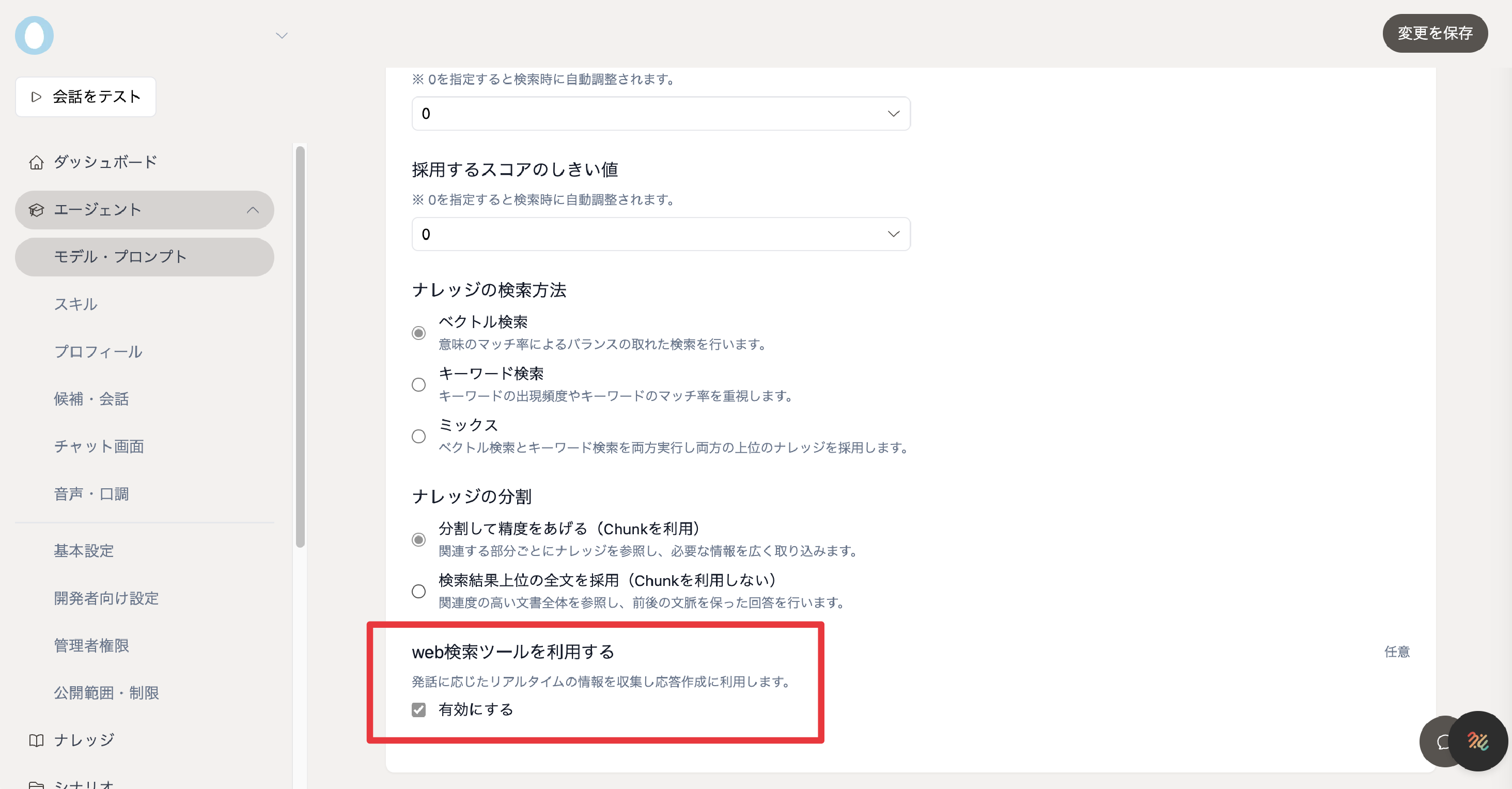 エージェント > モデル・プロンプト > 「専門知識」のカテゴリより、「web検索ツールを利用する」の「有効にする」にチェックをお入れください。