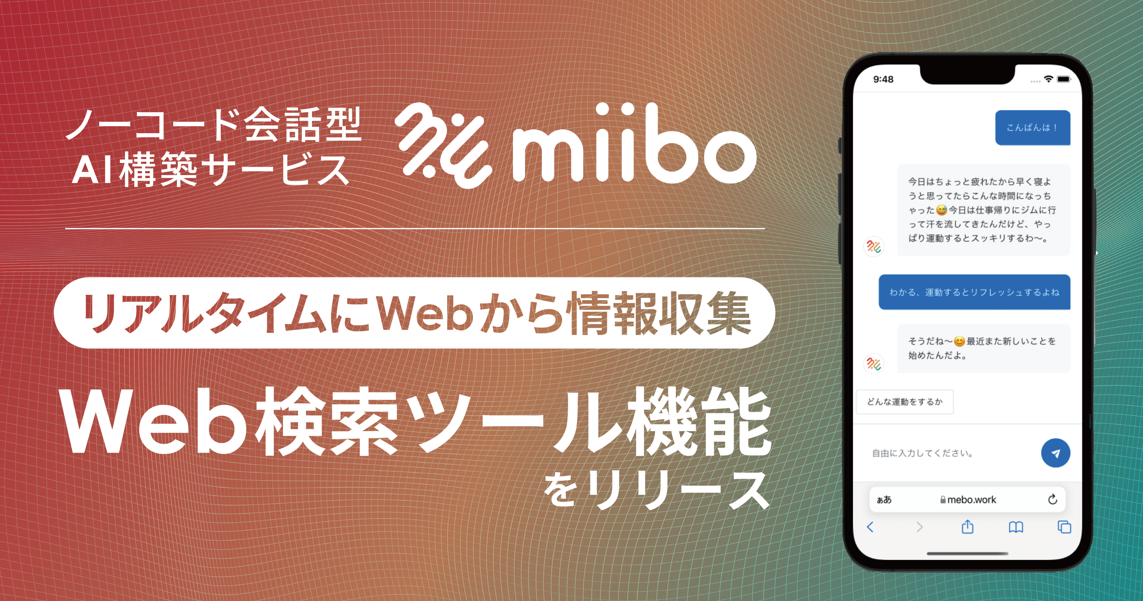 2026年3月17日より、miiboに新しく「Web検索ツール機能」が搭載されました。miibo上での会話内容に対して、リアルタイムにWebから情報収集を行い応答生成に利用する機能です。