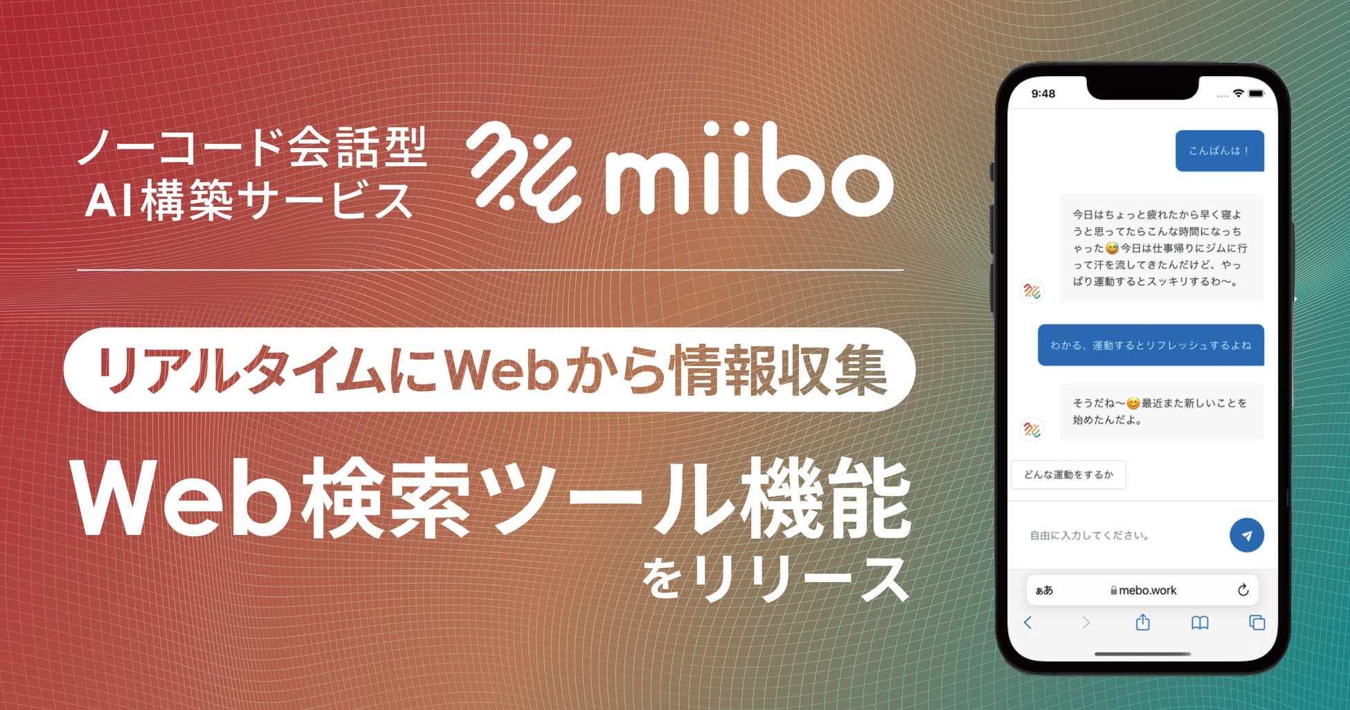 株式会社miibo(本社:東京都港区、代表取締役:功刀 雅士)は、当社が提供するノーコード会話型AIサービス「miibo」において、新機能「Web検索ツール機能」をはじめとした大幅なアップデートにより、より高性能・高速・高精度なAIをmiibo上で簡単に構築できる環境が整いました。